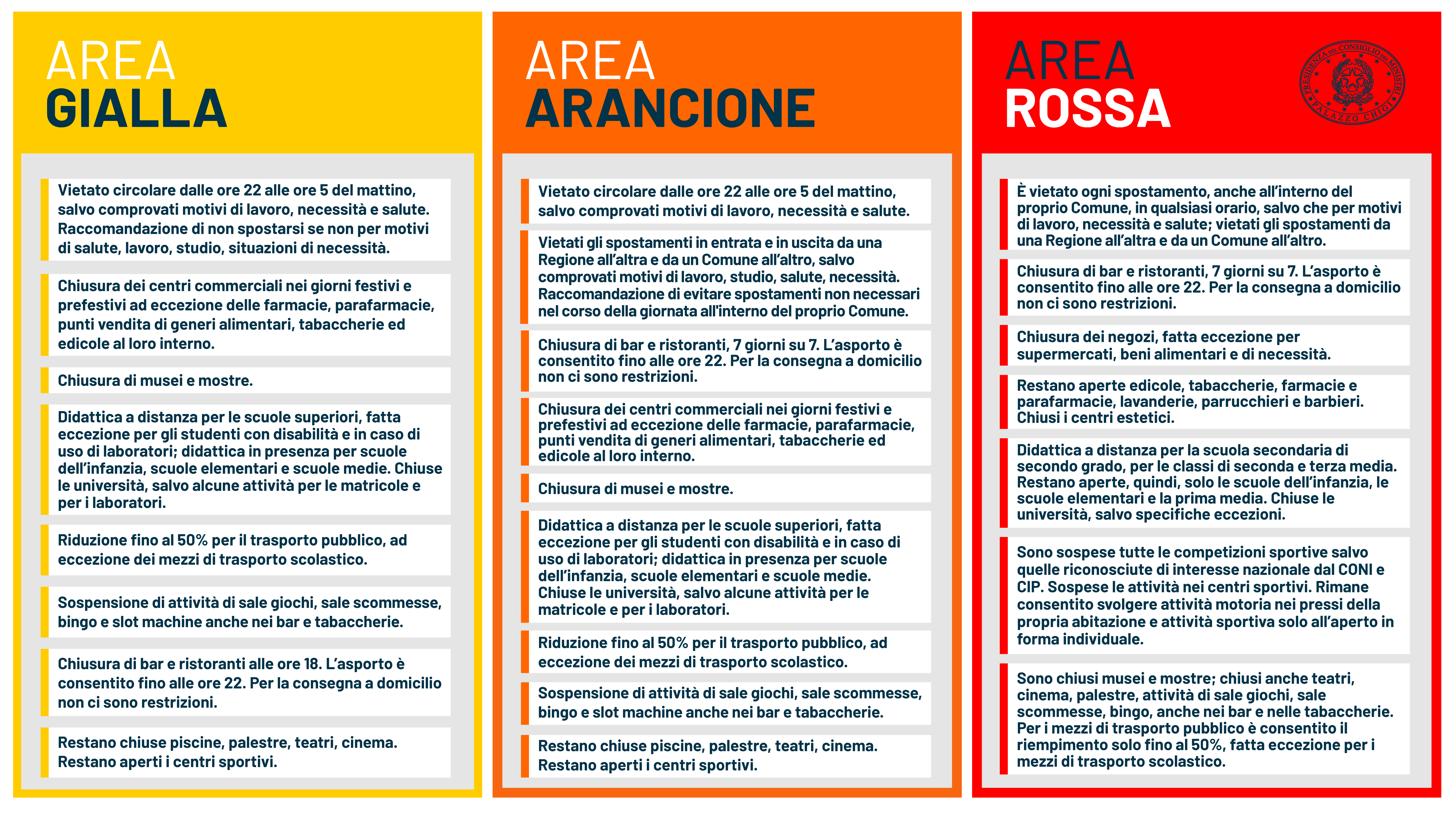 ZONE ROSSE: aree del territorio nazionale caratterizzate da uno scenario di massima gravità e da un livello di rischio alto (con misure ulteriori ancor più restrittive); sono Piemonte, Lombardia, Calabria e Valle D'Aosta