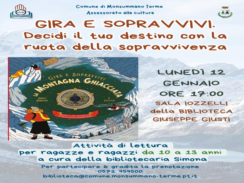 Lunedì 12 gennaio 2026, alle ore 17, in Biblioteca si terranno attività di lettura dal titolo "GIRA E SOPRAVVIVI. Decidi il tuo destino con la ruota della sopravvivenza", a cura della bibliotecaria Simona.