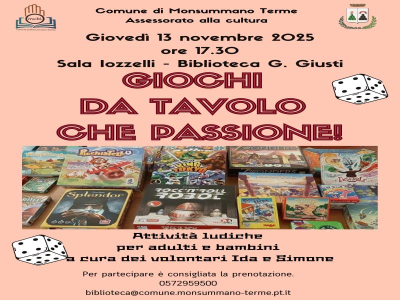 Il prossimo incontro di "GIOCHI DA TAVOLO, CHE PASSIONE!" si terrà giovedì 13 novembre 2025, alle ore 17.30, rivolto a tutte le persone, da 6 a 100 anni, che hanno voglia di divertirsi insieme e scoprire giochi di di società vecchi e nuovi.