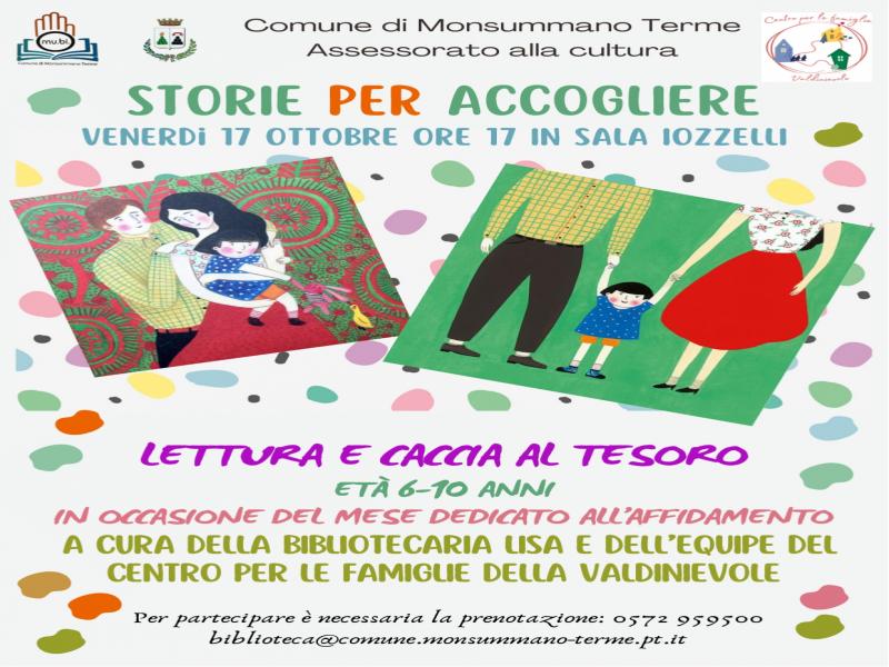 In occasione del Mese dedicato all'Affido familiare, venerdì 17 ottobre, alle ore 17, in Biblioteca si terranno attività di lettura e caccia al tesoro dal titolo "STORIE PER ACCOGLIERE", a cura della bibliotecaria Lisa e dell'equipe del Centro per le famiglie della Valdinievole.