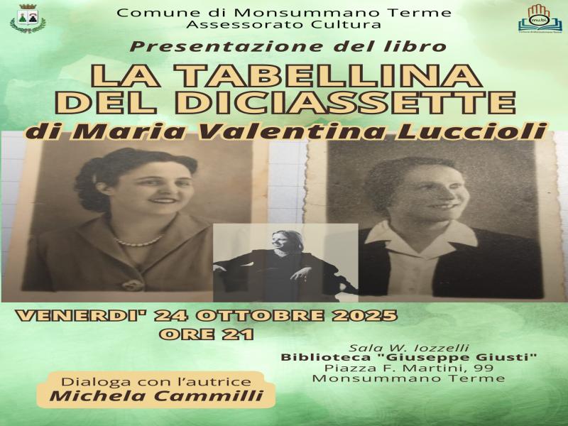 L'Assessorato alla Cultura del Comune di Monsummano Terme organizza la presentazione del libro "LA TABELLINA DEL DICIASSETTE" – Robin Edizioni di Maria Valentina Luccioli, che si terrà venerdì 24 ottobre 2025, alle ore 21, nella Sala “Walter Iozzelli” della Biblioteca comunale “Giuseppe Giusti”.